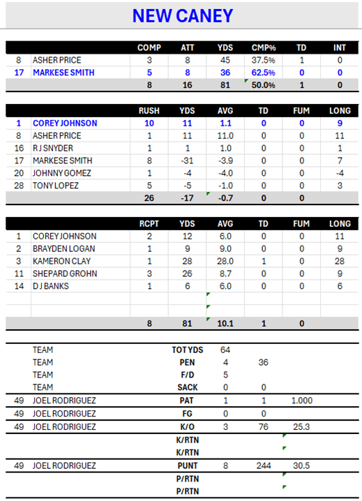 By halftime, the Mustangs had 38 points and over 300 yards of offense. Running backs Khristian White and Peyton Thomas added short-yardage touchdowns to balance the air attack, and the defense limited New Caney to just 64 yards all night.