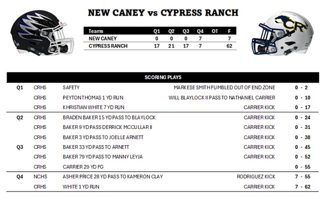 Thursday Night: Cypress Ranch 62, New Caney 7